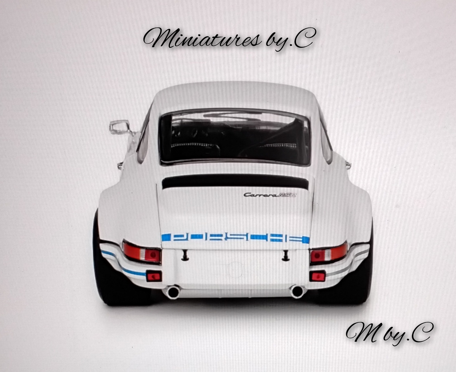 Magnifique reproduction de la mythique Porsche 911 RSR, avec sa livrée blanche et ses bandes Carrera bleues emblématiques.